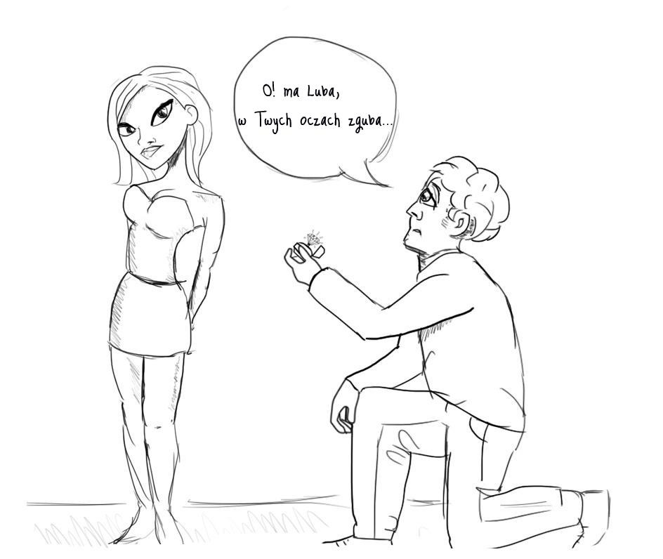 O! ma Luba, w Twych oczach zguba, Twe lico mnie zachwyco, ma Oblubienico, jam Zbyszek, pogromca myszek, dostaję skrętu kiszek, choć wychyliłem kieliszek, minę mam nietęgą, bo Twa odpowiedź potęgą, od Ciebie zależy me życie, czy odpowiesz należycie? Ofertyję Ci składam i ów pierścień na palec wkładam, czy zechcesz być mą - najwspanialszą i jedyną? Och, zawżdy chce Cię mieć każdy, lecz ja tu na kolano padam i twarz Twoją badam, czy nie zada mi rany i powie, żem i ja wybrany? Zgódź się, zgódź, Jagódko miła, będziesz ze mną dobrze żyła!