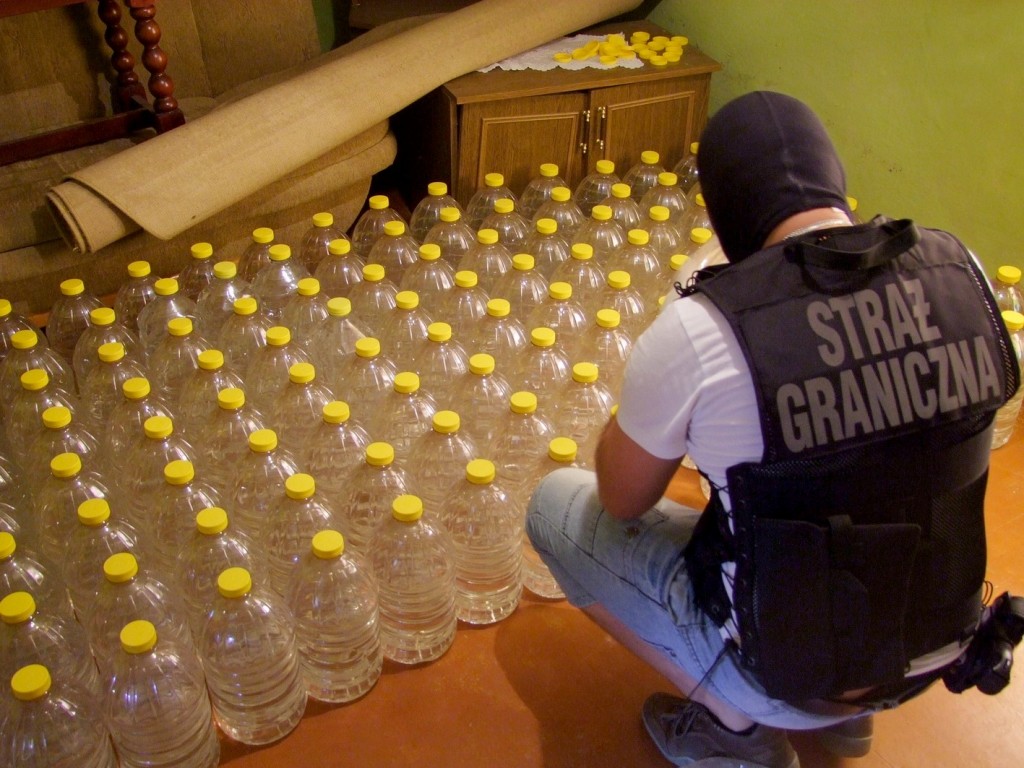 Chałupniczo zorganizowana linia technologiczna funkcjonowała na terenie jednej z posesji w powiecie bytowskim. Jak ustalili strażnicy graniczni, spirytus techniczny sprowadzano w hurtowych ilościach z woj. łódzkiego. Przy wykorzystaniu specjalnych pomp i filtrów alkohol był oczyszczany i rozlewany do pięciolitrowych plastikowych pojemników. Tak przygotowany trafiał do sprzedaży na terenie woj. pomorskiego. Na miejscu strażnicy graniczni zastali 36-letniego właściciela rozlewni, który butelki ze spirytusem akurat ładował do samochodu. Do rozwiezienia przygotowanych już było ponad tysiąc litrów alkoholu. Funkcjonariusze zabezpieczyli łącznie prawie 2 tysiące litrów alkoholu, 120 kg krajanki tytoniowej, pompy, filtry, cztery plastikowe zbiorniki o pojemności 1000 litrów każdy, prawie 200 plastikowych pięciolitrowych butelek i blisko 8 tysięcy nakrętek. Łączn ą wartość towaru i sprzętu szacuje się na ok. 240 tys. złotych.