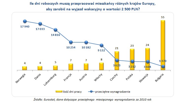 Najdłużej na swoje wakacje musi pracować Bułgar, któremu uzbieranie odpowiedniej kwoty zajmie prawie dwa miesiące (55 dni). Niestety, Polska znalazła się w ogonie przedstawionego zestawienia. Polakowi, który otrzymuje średnie wynagrodzenie krajowe, zarobienie na wakacje zajęłoby 23 dni. Podobnie byłoby w przypadku Słowaka (24 dni) oraz Czecha (21 dni).