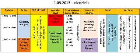 W sobotę 31 sierpnia i niedzielę 1 września 2013 r. w godz. 12:00 – 18:00 w nowej części PPNT, powstanie małe szwajcarskie miasteczko. Spotkać tam będzie można kuglarzy, kucharzy, grupę sportowców Movement oraz bboys. Zaplanowano wystawę komiksów szwajcarskich, literatury i zdjęć ze Szwajcarii wykonanych przez młodzież podczas lipcowego wyjazdu młodzieży. Jednym z wielu powodów, dla których warto wziąć udział w "Weekendzie Szwajcarskim" są także warsztaty z designu i recyklingu. W ich trakcie będzie można dowiedzieć się jak wykorzystać surowce wtórne, a efektem końcowym warsztatów będą eko-gry oraz elementy wyposażenia przestrzeni, w której wkrótce młodzi ludzie z "Wymiennikowni" będą pracować.