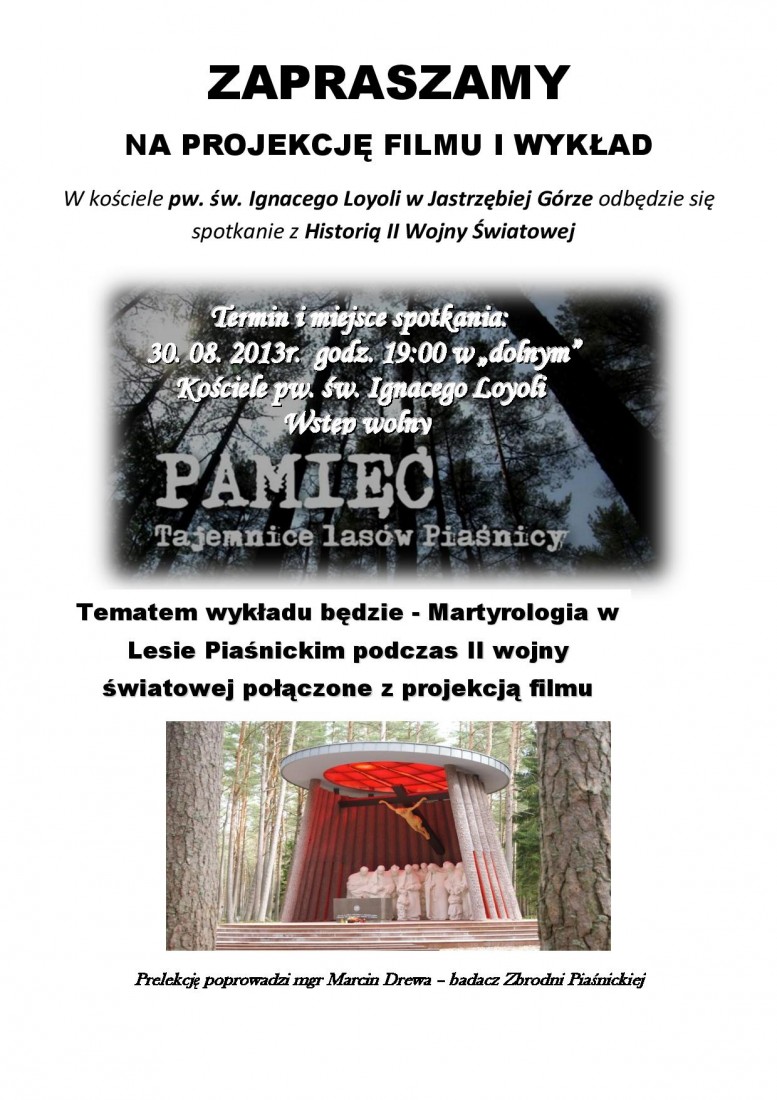 - W Piaśnicy zamordowano przedstawicieli polskiej inteligencji, administracji służb mundurowych, ale przede wszystkim duchowieństwa katolickiego. W Piaśnicy zginęła błogosławiona siostra Alicja Kotowska - przełożona Sióstr Zmartwychwstanek z Wejherowa, ks Edmund Fittkau, Anastazy Kręcki, Wojciech Pronobis, ks Bolesław Witkowski. Poniosło śmierć wielu wspaniałych Ojców Jezuitów m.in. - o. Błażej Blajer, o. Czesław Głowa, o. Karol Sudy oraz o. Edmund Ząbek. Dlatego tez miejsce wykładu i projekcji filmu (Kościół Ojców Jezuitów) jest nieprzypadkowe.