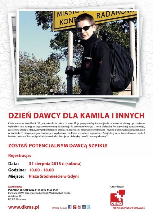 Ma na imię Kamil i w tym roku skończył liceum. Ponieważ uwielbia jeździć na dwóch kółkach, po maturze wybrał się z kolegą na wyprawę rowerową do Wenecji. Po powrocie wykryto u niego białaczkę. Obecnie przebywa w szpitalu i czeka na przeszczep. Dawca szpiku dla Kamila poszukiwany będzie w Gdyni najbliższą sobotę, 31 sierpnia, podczas festynu „Aktywne Pożegnanie Wakacji".