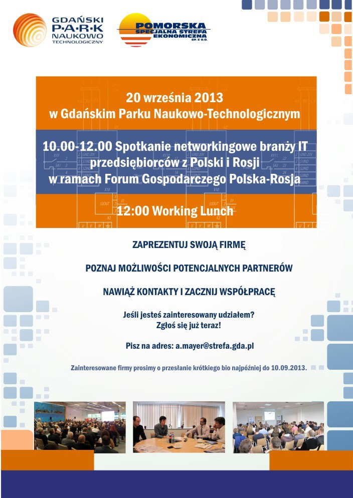 W ramach forum, 20 września w godz. 10.00-12.00, odbędzie się spotkanie networkingowe branży IT z przedsiębiorcami z Polski i Rosji. Jego ideą jest zaprezentowanie potencjału merytorycznego uczestników oraz zdefiniowanie sposobu stworzenia międzynarodowej sieci współpracy, a przede wszystkim umożliwienie nawiązania kontaktów pomiędzy firmami.