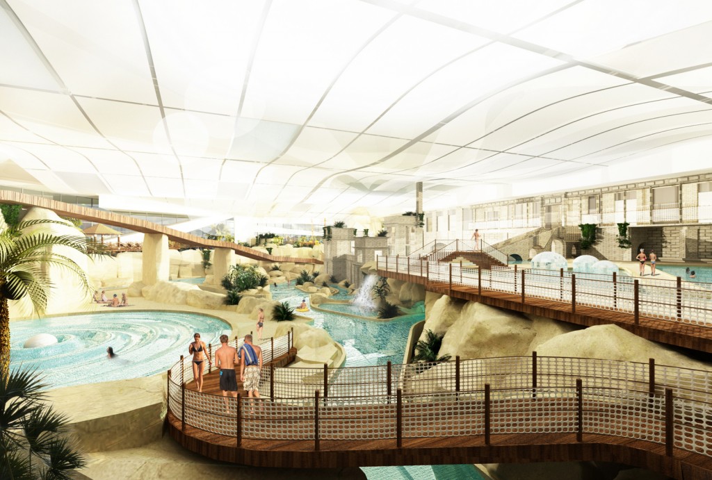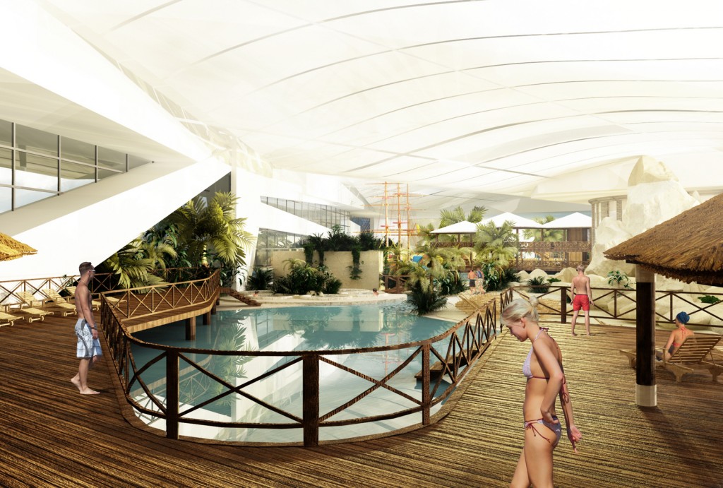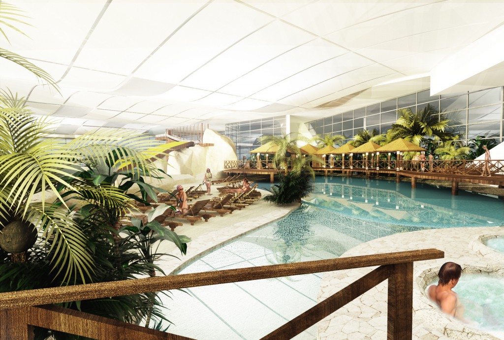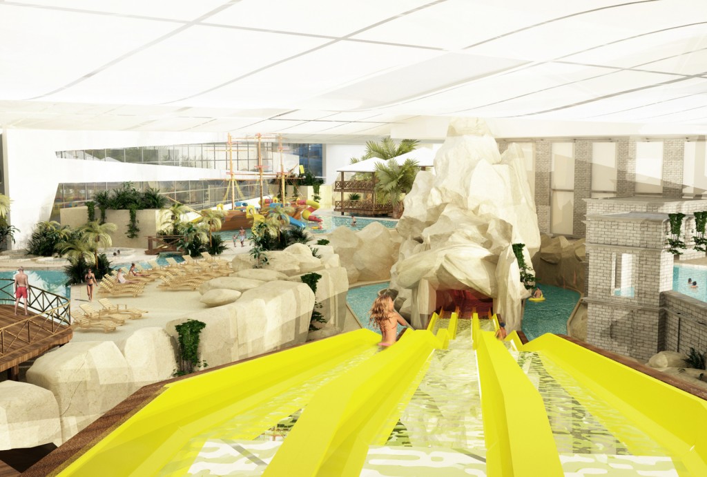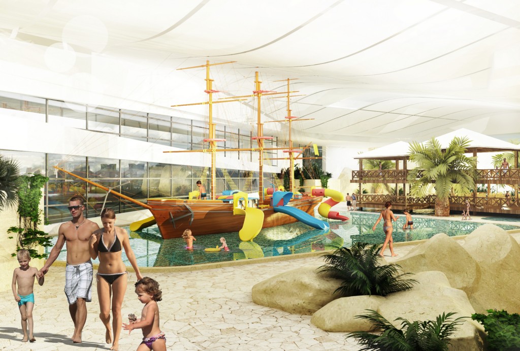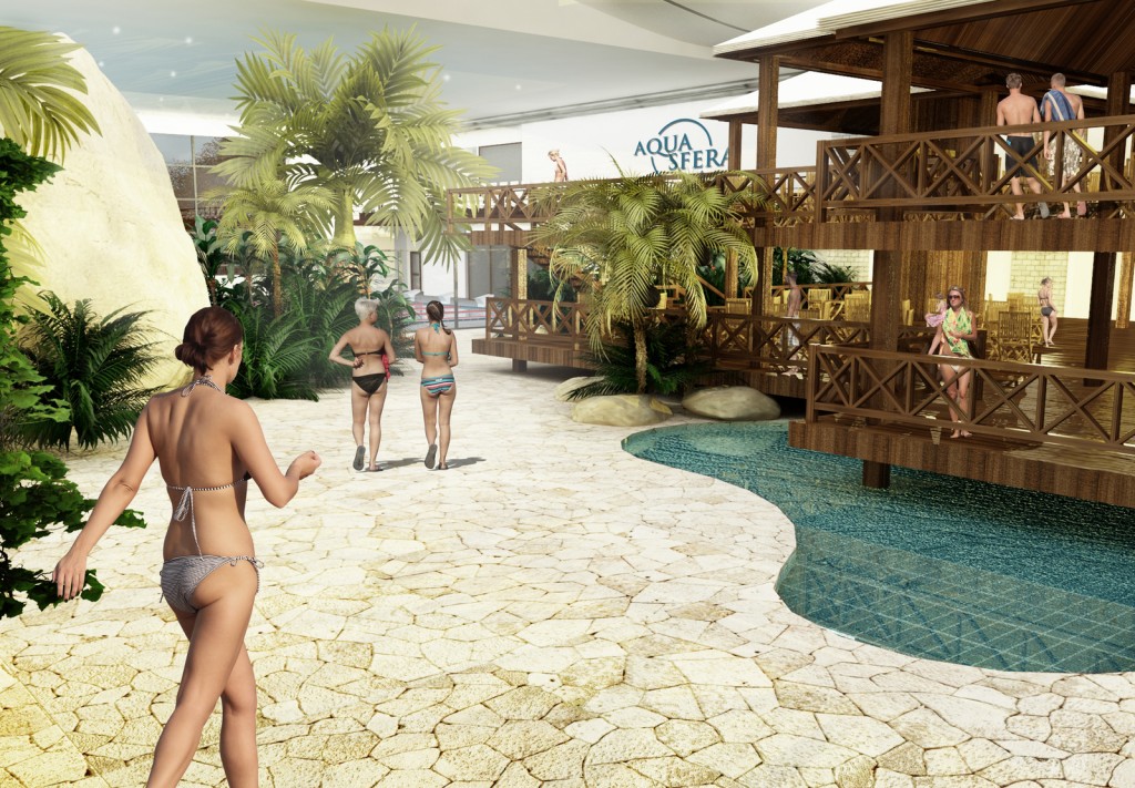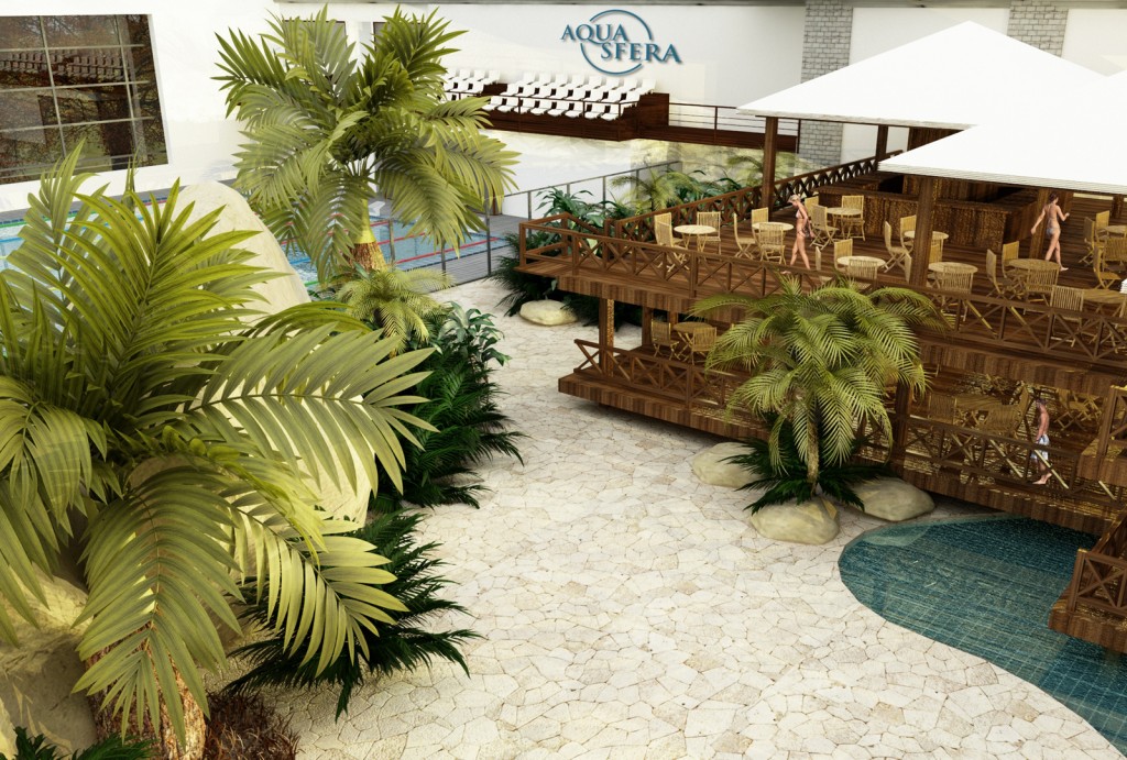 - kompleks basenów rekreacyjnych z rozbudowaną oferta dla dzieci i całych rodzin. Długa na ponad 350 metrów, pontonowa leniwa rzeka pełniąca rolę komunikacji między strefami, basen z kulą wywołującą fale oraz inne niespotykane atrakcje wodne z czego najbardziej rozpoznawalną będzie jedyna w tej części Europy zjeżdżalnia przez akwarium z rekinami. Jest to zarazem realizacją pasji i wieloletnich doświadczeń inwestora w zakresie akwarystyki morskiej.