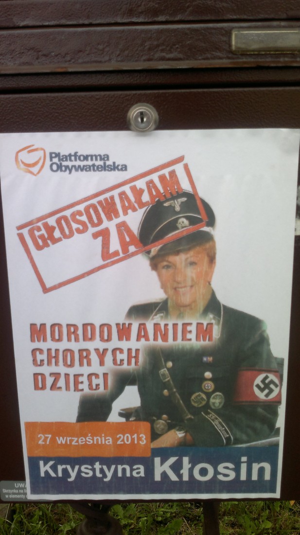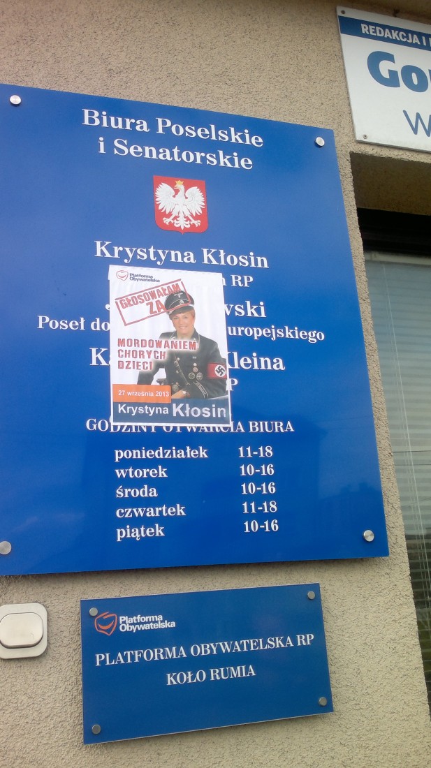 Na początku października informowaliśmy, że przed biurem poselskim Krystyny Kłosin rozwieszono plakaty na których widniał wizerunek poseł Kłosin w niemieckim mundurze ze swastyką. Zarówno w Polsce jak i na całym świecie używanie takich symboli jest zabronione. Plakaty rozwieszone były na skrzynce pocztowej, drzwiach wejściowych i tablicy ogłoszeniowej.