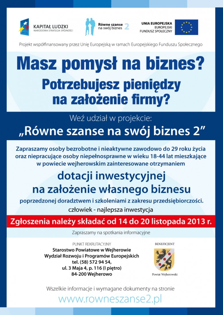 Starostwo Powiatowe w Wejherowie informuje, że dnia 25 października 2013 r. (piątek) został ogłoszony nabór do projektu „Równe szanse na swój biznes 2”.