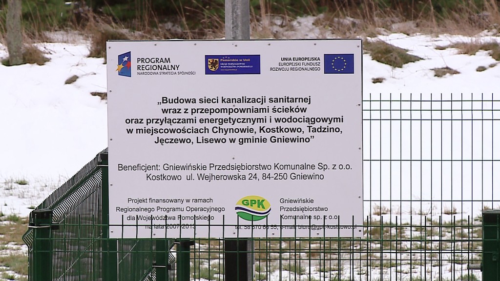 Gniewińskie Przedsiębiorstwo Komunalne Sp. z o. o. zakończyło realizację projektu współfinansowanego ze środków Europejskiego Funduszu Rozwoju Regionalnego w ramach RPO WP na lata 2007 – 2013. Inwestycja dotyczy budowy sieci kanalizacji sanitarnej ciśnieniowej w miejscowościach Chynowie, Kostkowo, Tadzino, Jęczewo. W wymienionych miejscowościach wybudowano 4 tłocznie ścieków.