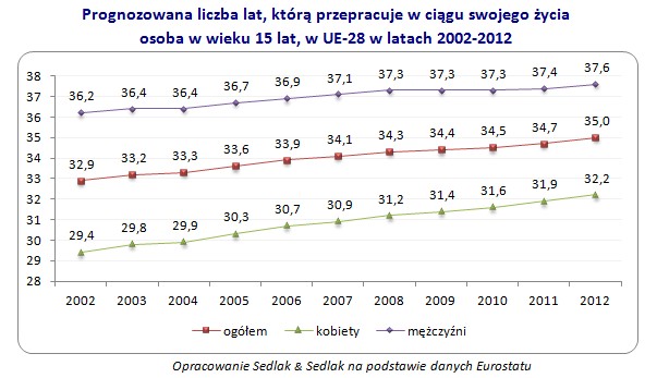 W 2002 roku przewidywany czas pracy mężczyzn wynosił 36,2 lat, zaś w 2012 roku 37,6 lat – a więc o 1,4 roku dłużej. Jednak to w przypadku kobiet szacowana liczba lat pracy zwiększyła się w większym stopniu – z 29,4 lat w 2002 roku do 32,2 lat w 2012 roku, a więc o 2,8 lat.