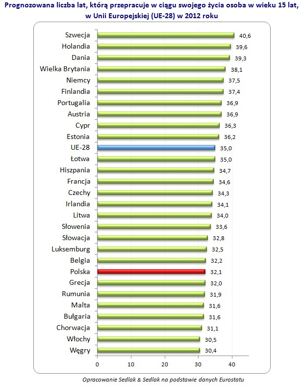 W 2012 roku wśród krajów europejskich najdłuższą prognozę lat czasu pracy, jaki czeka statystycznego 15-latka, odnotowano dla Szwecji (40,6 lat). Średnio w UE-28 przewidywano natomiast 35 lat aktywności zawodowej. W Polsce szacowano tę wartość na 32,1 lat. Najkrócej, wedle szacunków Eurostatu, pracować będą Węgrzy (30,4 lat).