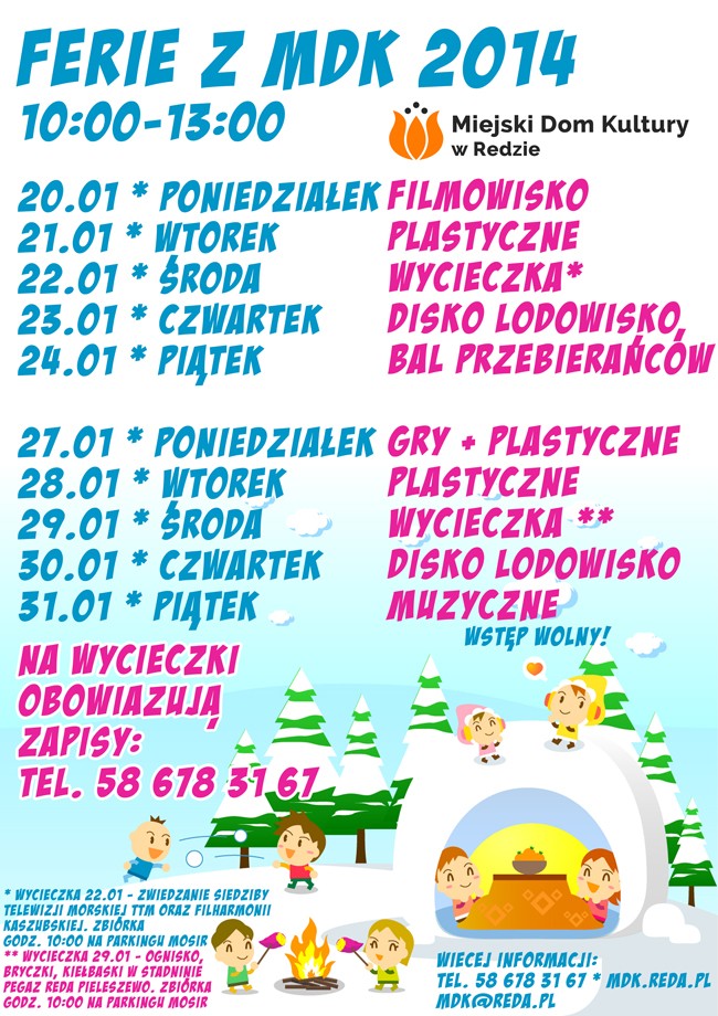 Placówka Wypoczynku Dzieci i Młodzieży z Gdyni (PWDiM, ul. Wiczlińska 52) organizuje podczas ferii zimowych 2014 opiekę nad dziećmi w wieku od 6 do 12 lat (od godz. 7.30 do 16.30) w formie nietypowych, wycieczkowych półkolonii „Wędrowne Ferie 2014". Szczegóły wraz z programem znajdują się na stronie: www.pwdim.pl.