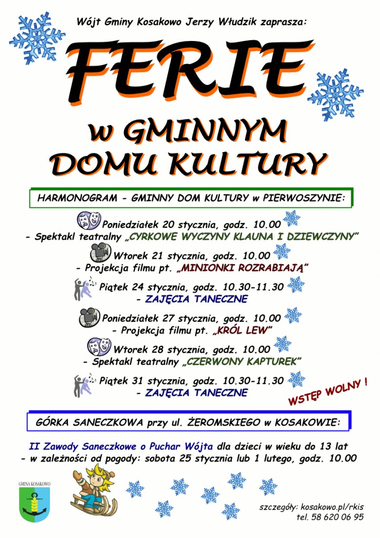 Wstęp na wszystkie wymienione poniżej wydarzenia jest bezpłatny. Organizatorem Ferii w Domu Kultury jest Wójt Gminy Kosakowo Jerzy Włudzik.