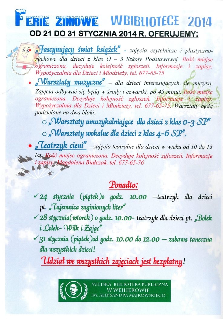 Na zajęcia czytelnicze i plastyczno-ruchowe dla dzieci z klas 0-3 szkół podstawowych z cyklu „Fascynujący świat książek” oraz na Warsztaty Muzyczne należy zapisywać się w Wypożyczalni dla dzieci i młodzieży pod tel. 677 65 75.
