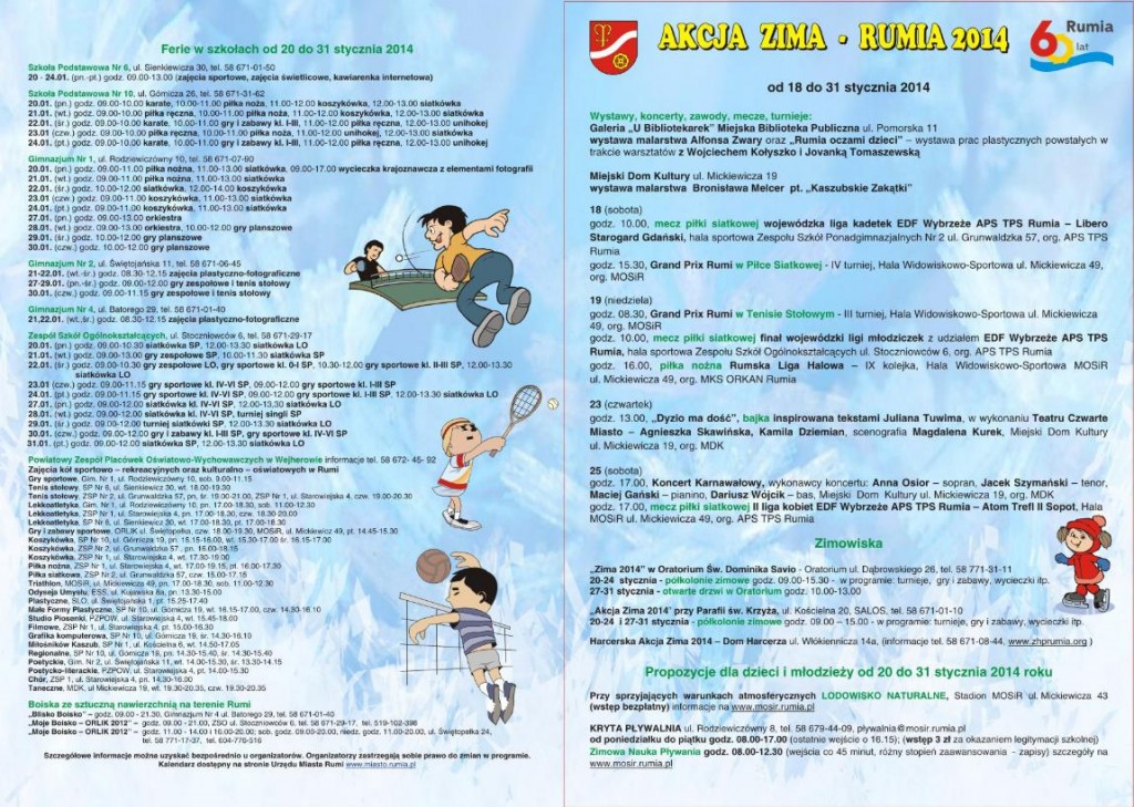 Biuletyn „Akcji Zima 2014” w Rumi znajduje się na stronie internetowej: www.miasto,.rumia.pl, a także w Urzędzie Miasta Rumi oraz placówkach organizujących zajęcia podczas ferii w naszym mieście. Miejski Ośrodek Sportu i Rekreacji w Rumi zapowiada, że jeżeli pozwolą warunki pogodowe, powstanie naturalne lodowisko na stadionie miejskim przy ul Mickiewicza. Do tego potrzebny jest jednak mróz co najmniej -7 st. C.