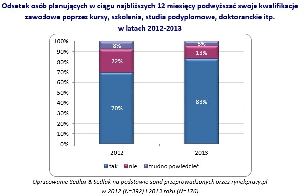 Jak wynika z sond przeprowadzonych przez portal rynekpracy.pl w 2012 i 2013 roku odpowiednio 70% i 83% badanych planowało w ciągu najbliższych 12 miesięcy podwyższać swoje kwalifikacje zawodowe poprzez kursy, szkolenia, studia podyplomowe, doktoranckie itp. W analizowanym okresie nastąpił wzrost deklaracji odnośnie chęci dokształcania o 13 punktów procentowych. W 2013 roku jedynie 13% respondentów nie planowało rozwijania swoich kwalifikacji zawodowych w ciągu najbliższego roku, zaś 5% ankietowanych nie potrafiło jednoznacznie odpowiedzieć na zadane pytanie.