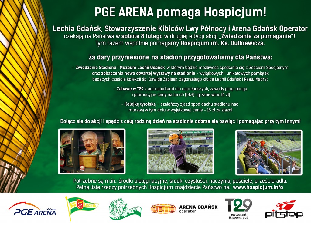 W sobotę, 8 lutego na PGE Arenie wyjątkowe wydarzenie. Na ten dzień Lechia Gdańsk, Stowarzyszenie Kibiców Lechii Gdańsk „Lwy Północy” oraz Arena Gdańsk Operator, zaplanowali wspólnie wyjątkowe atrakcje, a skorzystać z nich będzie można przyłączając się do akcji zbierania darów dla Hospicjum im. Ks. Dutkiewicza.