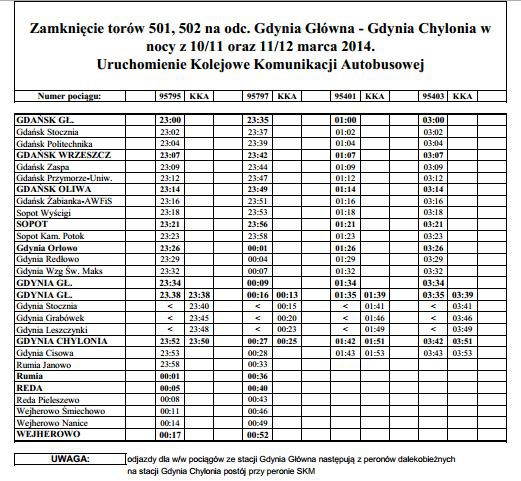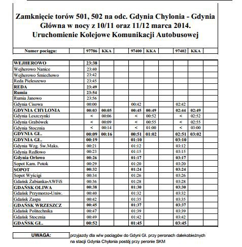 - PKP Szybka Kolej Miejska w Trójmieście Sp. z o.o. informuje, że w nocy z 10 na 11 oraz z 11 na 12 marca 2014 r. w związku z pracami torowymi na odcinku Gdynia Główna - Gdynia Chylonia - Gdynia Główna, ruch pociągów SKM na tym odcinku będzie się odbywał po torach dalekobieżnych. Uruchomiona zostanie Kolejowa Komunikacja Autobusowa - czytamy na stronie SKM.