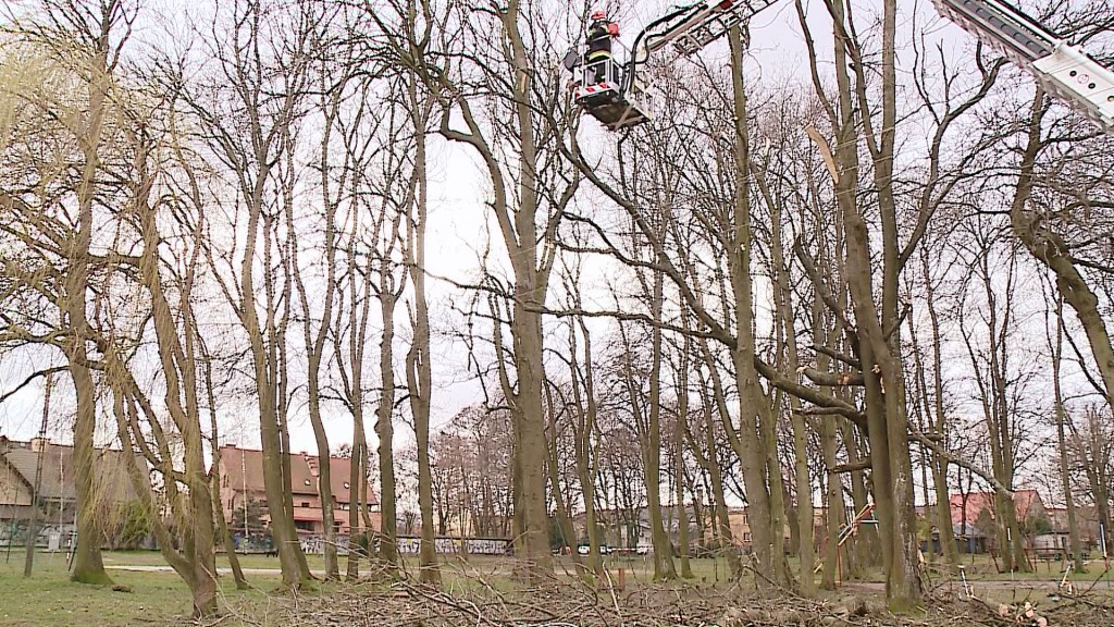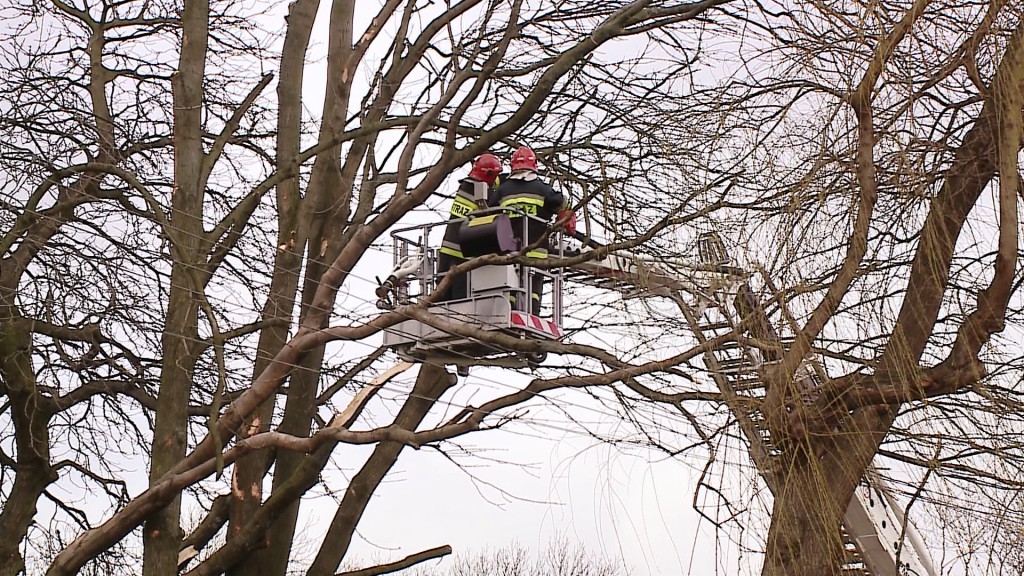 Na miejscu pracował specjalny podnośnik. Meteorolodzy podają, że wiatr osłabnie około godziny 18:00.