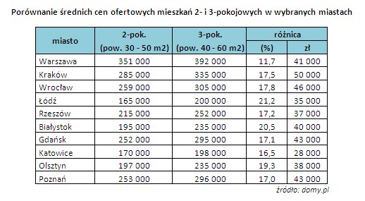 Jak wynika z badań w styczniu 2014 roku w Trójmieście zainteresowanych zakupem mieszkań 2 pokojowych było 45,8% z całego grona zainteresowanych. Mieszkaniami 3 pokojowymi interesowało się 27,1% całości zainteresowanych. To znacząca różnica. Pytanie jednak czy nie warto pomyśleć o większym mieszkaniu, mieszkaniu docelowym. Przy wyborze dobrej lokalizacji i dobrej cenie zakupu takie mieszkanie może stać się stabilnym lokum dla obecnej i przyszłej rodziny. Taki wybór pozwala lepiej zorganizować się w mieszkaniu. Oddzielić część dzienną od sypialnej dla rodziców i dziecka lub dzieci, czy stworzenie niekrępującego miejsca pracy. Przedstawię Państwu różnice cenowe, jakie wynikają z wyboru pomiędzy mieszkaniem 2-pokojowym a 3-pokojowym w wybranych miastach Polski.
