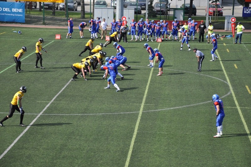 Kibice zgromadzeni w niedzielny, chłodny wieczór na Narodowym Stadionie Rugby w Gdyni nie zawiedli się. Od pierwszych minut spotkania oba zespoły popisywały się pięknymi podaniami w ataku i potężnymi uderzeniami w obronie. Pierwsze punkty w meczu zdobył amerykański rozgrywający Seahawks Lance Kriesien po świetnej, 51-jardowej akcji biegowej. Kozły odpowiedziały touchdownem biegowym swojego quarterbacka Taylora Lathama.