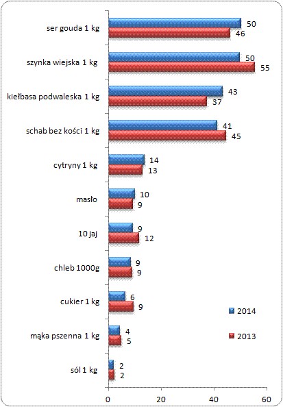 Na podstawie przeciętnych cen skomponowaliśmy wielkanocny zestaw składający się z siedmiu popularnych świątecznych produktów: 10 jaj, 0,5 kg żółtego sera, 200 g kostki masła, przeciętnego bochenka chleba oraz po kilogramie: kiełbasy podwawelskiej, szynki wiejskiej, mąki pszennej i soli. Dodatkowo wliczyliśmy koszt składników spożywczych, jakie potrzebne są do wypieku cytrynowej baby wielkanocnej. Jeszcze w 2010 roku cena podstawowego koszyka świątecznego wyniosła 59,68 PLN. Dwa lata później trzeba było wydać niewiele więcej: 60,42 PLN. W bieżącym roku wzrost cen widać wyraźniej i za koszyk musimy wyłożyć 68,43 PLN.