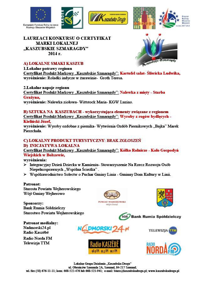 Laureaci konkursu o certyfikat marki lokalnej "Kaszubskie Szmaragdy":