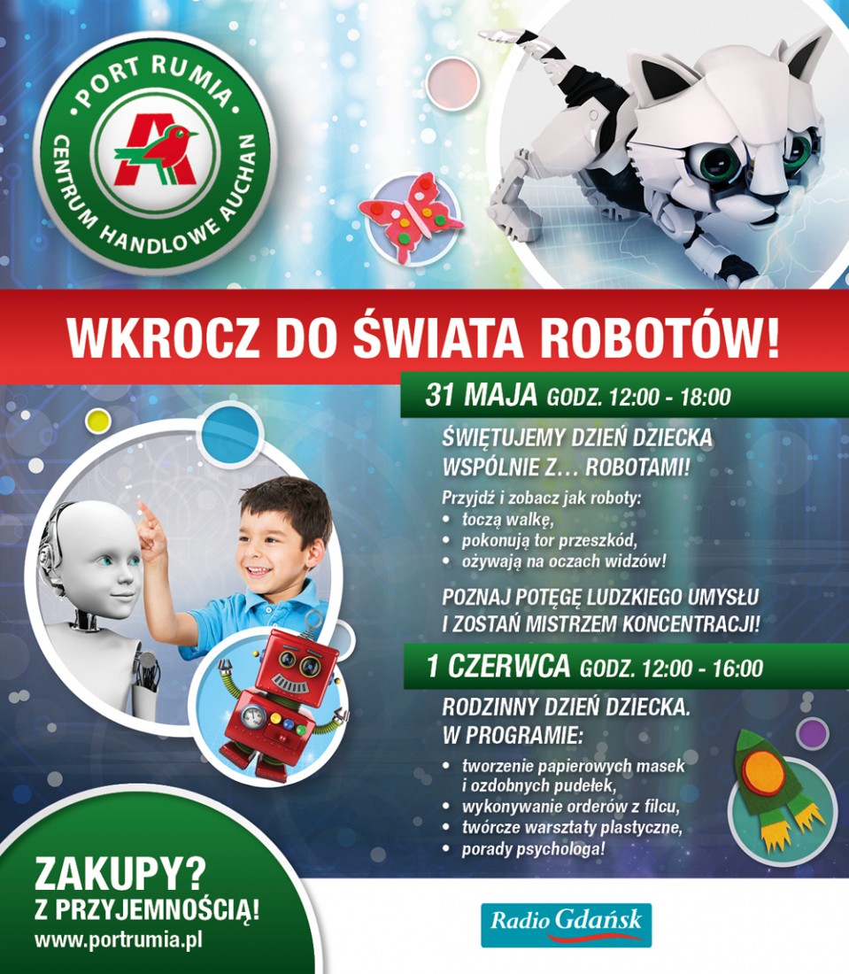 Atrakcje na Dzień Dziecka odbędą się w Porcie Rumia Centrum Handlowym Auchan przy ulicy Grunwaldzkiej 108 w Rumi. Z osiągnięciami robotyki będzie się można zapoznać w sobotę 31 maja od godziny 12.00 do godziny 18.00. Rodzinne warsztaty artystyczne oraz porady specjalistów odbędą się zaś w niedzielę 1 czerwca w godzinach 12.00 – 16.00.