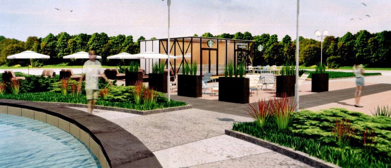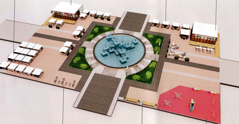 Dwa przeszklone lokale o wymiarach 8 x 7 m i 9 x 7 m staną po obu stronach fontanny. Każdy z nich będzie miał też zewnętrzne patio z eleganckimi parasolami i miejscami do siedzenia. Ponadto, w jednym rogu placu zostanie urządzony plac zabaw dla najmłodszych z poliuretanową nawierzchnią i huśtawkami, zjeżdżalnią, a także małymi karuzelami. Będzie też gdzie zostawić rower, bo projekt zakłada także postawienie stojaków.