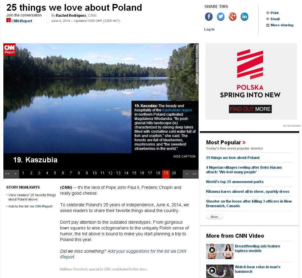 Lista powstała w związku z 25-rocznicą pierwszych częściowo wolnych wyborów w Polsce. CNN zachęca do zaplanowania podróży do Polski oraz wymienia 25 miejsc, potraw, cech, wydarzeń za które można pokochać nasz kraj. Wśród nich znajdują się między innymi Kaszuby, molo w Sopocie, kawa, oscypki, Przystanek Woodstock czy polskie poczucie humoru. Całą listę można sprawdzić TUTAJ
