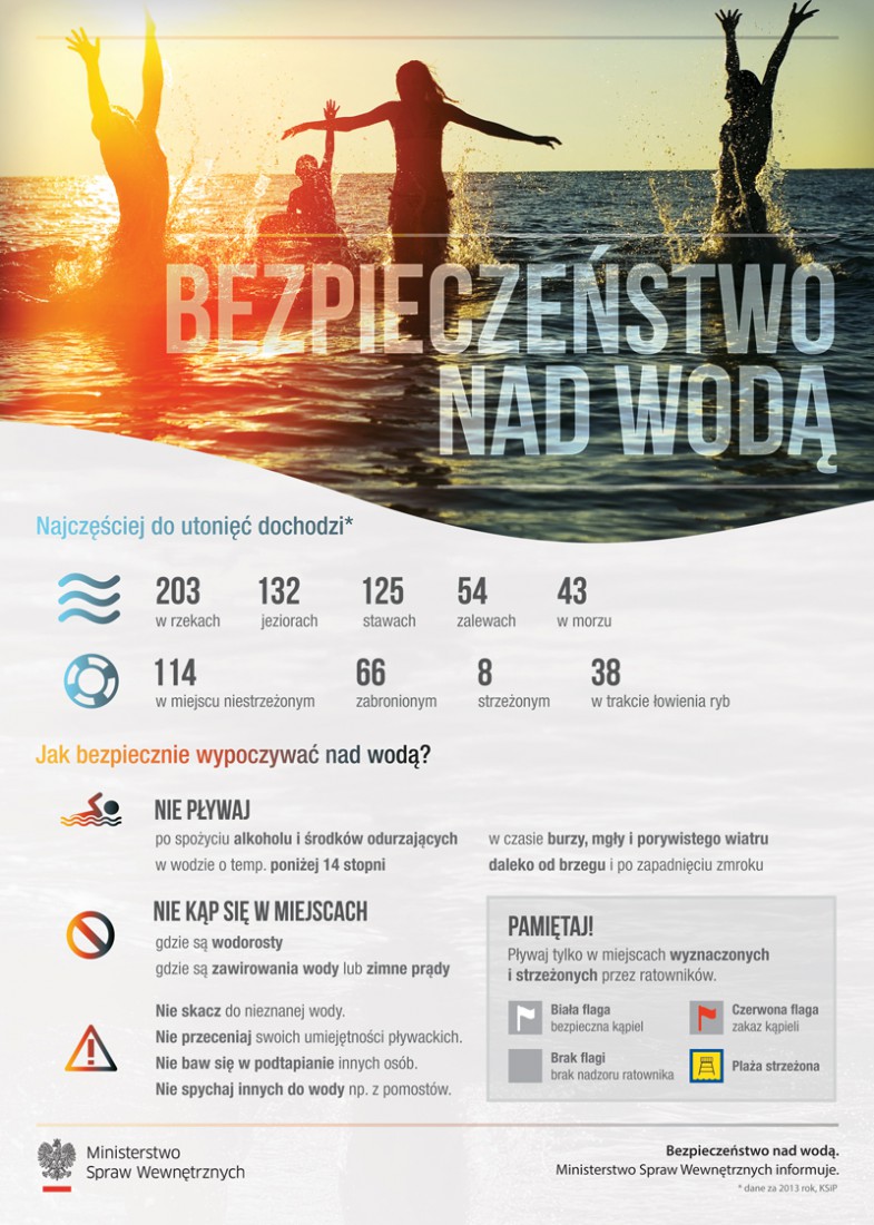 Statystyki bezlitośnie pokazują, że do utonięć najczęściej dochodzi na kąpieliskach niestrzeżonych oraz w akwenach, w których obowiązuje zakaz pływania. Tylko w zeszłym roku w takich miejscach utonęło prawie 200 osób. Te osoby uniknęłyby śmierci, jeśli na miejsce swojego wypoczynku wybrałyby kąpielisko strzeżone. Dlatego bezwzględnie należy stosować się tej podstawowej zasady i kąpać się tylko tam, gdzie pozostajemy pod okiem ratownika. Jeśli dodamy do tego zdrowy rozsądek i szacunek do wody, a zrezygnujemy z brawury i bezmyślności nasz wypoczynek będzie bezpieczny.