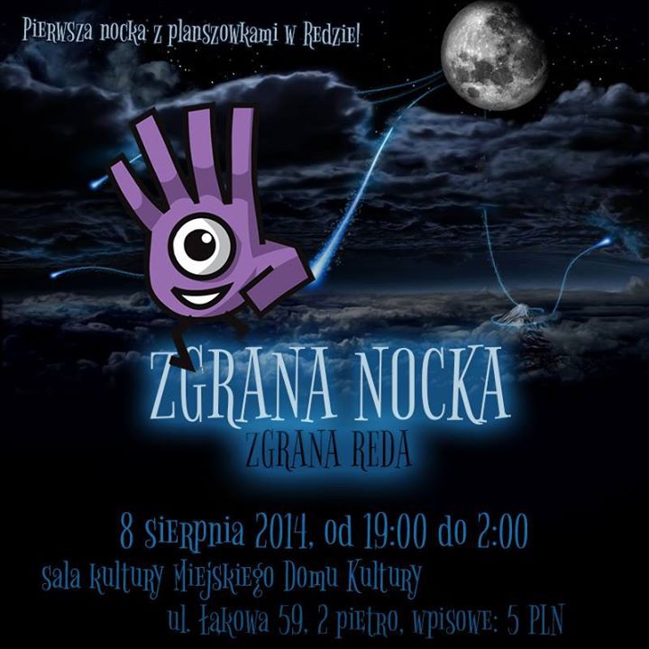 Gry będą na Was czekały w jednej z sal Miejskiego Domu Kultury w Redzie przy ul. Łąkowa 59, od godziny 19.00 do 2.00 w nocy. Impreza ta pozwoli Wam w spokoju poznać nieco większe i dłuższe gry, na które przy normalnej imprezie po prostu nie starcza czasu. Podczas Zgranej Nocki odbędzie się także turniej w grze „MASKARADA” w którym nagrody sponsoruje REBEL.