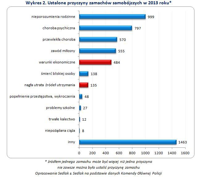 Statystyki Komendy Głównej Policji pokazują dodatkowo, że przyczyny ekonomiczne są jednymi z najczęstszych powodów zamachów samobójczych. W roku 2013 zanotowano 484 samobójstwa z powodu złych warunków ekonomicznych oraz 135 z powodu nagłej utraty źródeł utrzymania. Najczęstszym powodem samobójczych zgonów były nieporozumienia rodzinne. Należy także pamiętać, że na decyzję o popełnieniu samobójstwa może składać się wiele różnych czynników.