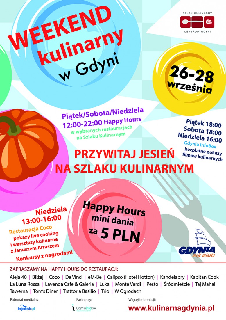 Od piątku do niedzieli w określonych godzinach - Happy Hours - w 20 restauracjach na Szlaku Kulinarnym serwowane będą mini dania w promocyjnej cenie 5 PLN. Warto wybrać się na spacer tym szlakiem i odbyć kulinarną podróż po czterech kontynentach, gdyż podczas Weekendu Kulinarnego będzie można m.in. odwiedzić słynącą z orientalnych smaków i przypraw restaurację indyjską, zjeść przysmaki ze słonecznych Włoch w licznie reprezentowanej w Gdyni „cucina italiana", spróbować specjałów kuchni amerykańskiej oraz lekkich dań kuchni francuskiej. Ponadto nie zabraknie oczywiście pysznych potraw reprezentujących nasze rodzime kulinaria i, jak przystało na nadmorskie miasto, dań rybnych.