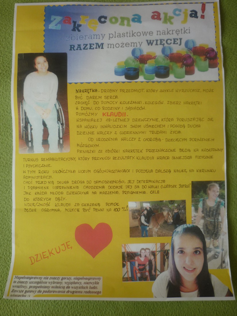 Koszty rehabilitacji przerastają możliwości finansowe Klaudii, dlatego zbierane są nakrętki plastikowe, z których pieniążki są przekazywane na subkonto w Fundacji „Słoneczko” i przeznaczone na turnusy rehabilitacyjne w Centrum Hipoterapii i Rehabilitacji „Zabajka” w Stawnicy.
