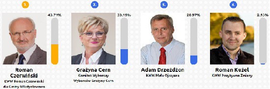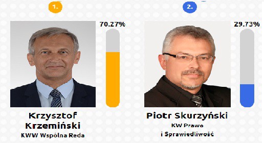 Według głosujących najlepiej na stanowisku burmistrza sprawdzi się Roman Czerwiński (43,71%). Na drugim miejscu plebiscytu uplasowała się aktualna burmistrz, czyli Grażyna Cern (33,19%). Trzecie miejsce zajął Adam Drzeżdżon (20,97%), czwarte Roman Kużel (2,13%).