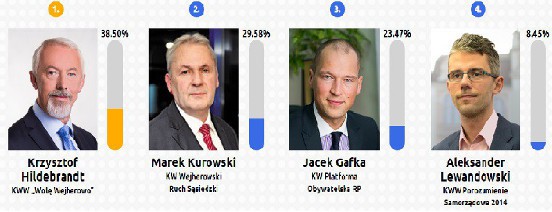 Największe poparcie wśród głosujących otrzymał Krzysztof Hildebrandt, obecny prezydent Wejherowa (38,50%). Na drugim miejscu uplasował się Jacek Kurowski (29,58%), trzeci jest Jacek Gafka (23,47%), czwarty Aleksander Lewandowski (8,45%).