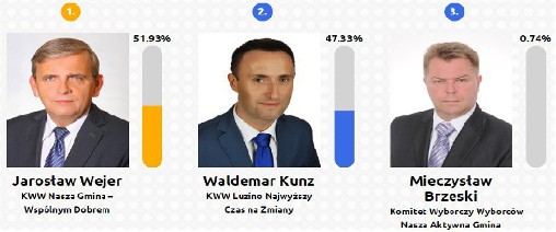 Największą popularnością w naszym plebiscycie wyborczym w gminie Luzino cieszy się Jarosław Wejer (51,93%), niewiele mniej głosów oddano na Waldemara Kunz (47,33%). Na ostatnim miejscu znajduje się Mieczysław Brzeski (0,74%).