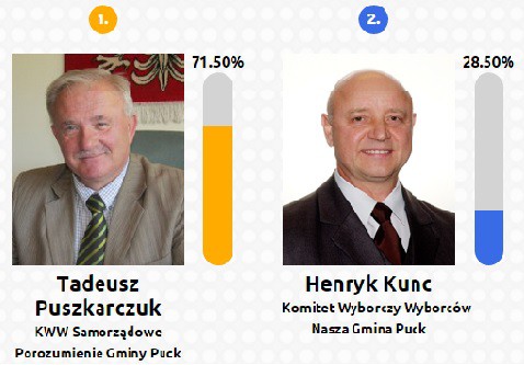 Najwięcej głosów na wójta gminy Puck oddano na Tadeusza Puszkarczuka (71,50%), jego przeciwnik, Henryk Kunc, zdobył 28,50% głosów.