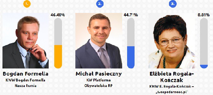 W fotelu burmistrza Rumi według głosujących w plebiscycie powinien zasiąść Bogdan Formella. Uzyskał on 46,48% wszystkich głosów. W plebiscycie na drugim miejscu z wynikiem 44,71% uplasował się Michał Pasieczny. Najmniejszą ilość głosów zdobyła dotychczasowa burmistrz Rumi, Elżbieta Rogala-Kończak (8,81%).