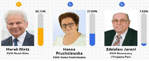 Według wysyłających SMS-y, w fotelu burmistrza Pucka, powinien zasiąść Marek Rintz (55,13%), kolejne miejsce zajęli Hanna Pruchniewska (37,04%) i Zdzisław Jaroni (7,82%).