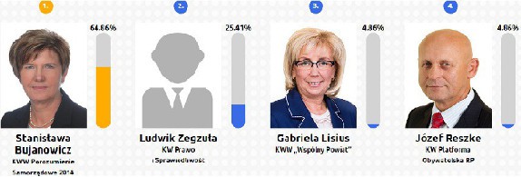 64,86% głosów oddano na Stanisławę Bujanowicz, drugi pod względem ilości oddanych głosów jest Ludwik Zegzuła (25,41%), kolejną Gabriela Lisius (4,86%) i dotychczasowy starosta Józef Reszke (4,86%).