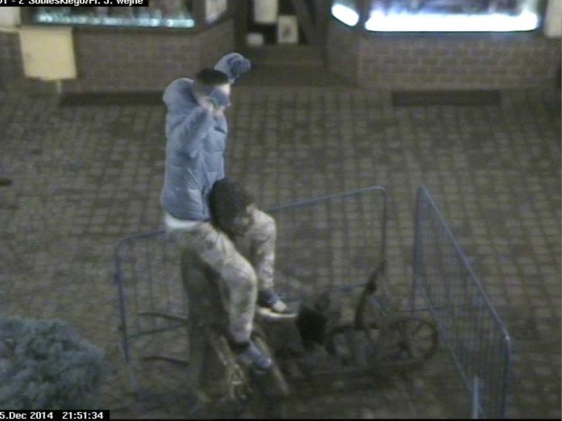 Następnie około godziny 22:00 dyżurny Straży Miejskiej zauważył na ekranie ulicznego monitoringu nieletniego, który skakał po pomniku Remusa, znajdującym się na wejherowskim deptaku. Chłopak pozował również do zdjęć, które robili jego znajomi.