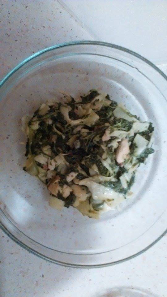 - Makaron gotujemy, pierś z kurczaka kroimy w kosteczkę i podsmażamy na oliwie. Dodajemy szpinak, śmietanę, czosnek, ser topiony i ser żółty, sól i pieprz do smaku.