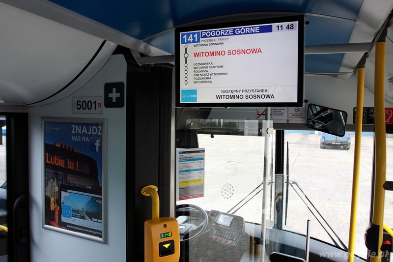 Autobusy wyposażone zostały między innymi w wewnętrzne wyświetlacze elektroniczne na których prezentowane będą nazwy przystanków.