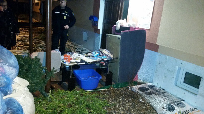 Część rzeczy należących do osoby eksmitowanej, pod jej nieobecność, została wyrzucona przez okno na pobliski chodnik.