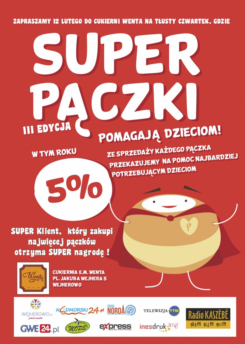 W tym roku pączkowych smakoszy czeka niespodzianka! Super klient, który zakupi najwięcej super pączków otrzyma również super nagrodę! Pięć wybranych osób zostanie zaproszonych na walentynkowy poczęstunek do Cukierni Wenta. Z osoba towarzyszącą będą mogli słodko spędzić czas...