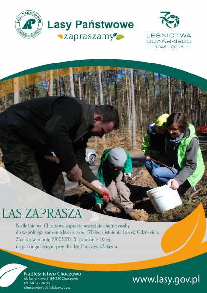 Nadleśnictwo Choczewo serdecznie zaprasza wszystkie chętne osoby do wspólnego sadzenia lasu. W bieżącym roku lasy gdańskie obchodzą jubileusz 70-lecia powstania Regionalnej Dyrekcji Lasów Państwowych w Gdańsku.