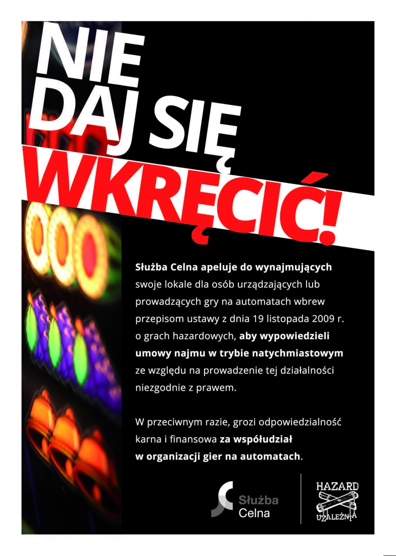 Służba Celna apeluje do wynajmujących swoje lokale dla osób urządzających lub prowadzących gry na automatach wbrew przepisom ustawy z dnia 19 listopada 2009 r. o grach hazardowych, aby wypowiedzieli umowy najmu w trybie natychmiastowym ze względu na prowadzenie tej działalności niezgodnie z Ustawą o grach hazardowych. W przeciwnym wypadku, w sytuacji kontroli dokonywanej przez Służbę Celną wynajmujący z mocy prawa znajdzie się w gronie osób uznanych za organizatorów gier na automatach i obciążony karą administracyjną w wysokości 12.000 zł od jednego automatu.