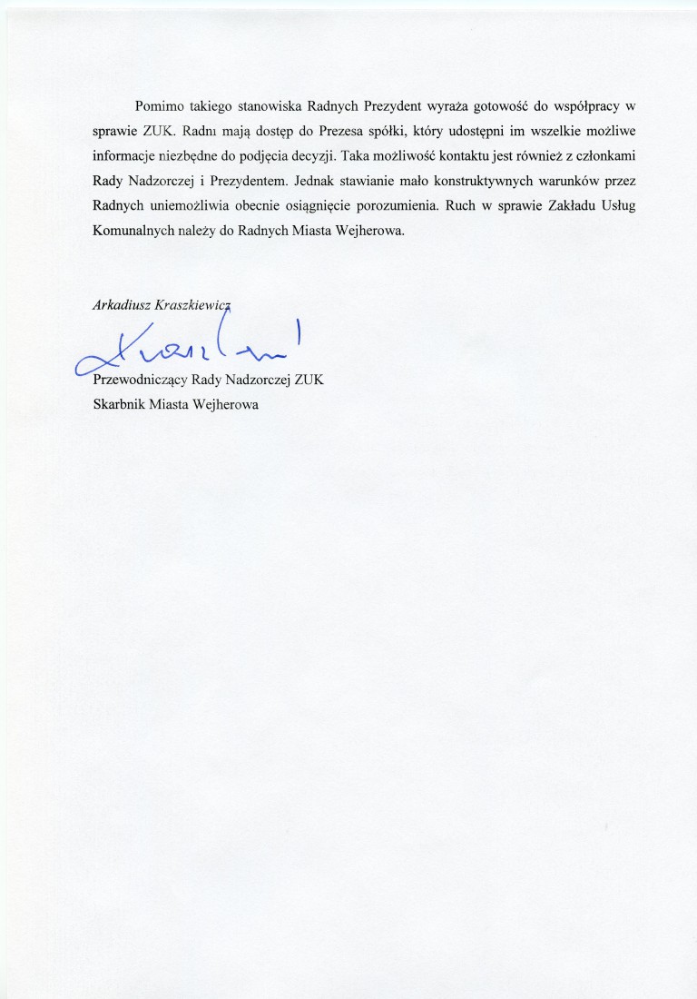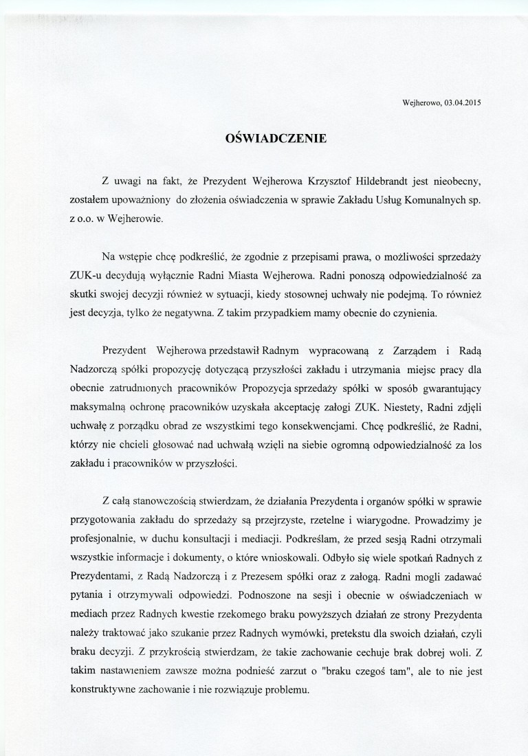 Oświadczenie ws. Zakładu Usług Komunalnych w Wejherowie, w imieniu prezydenta miasta, złożył Arkadiusz Kraszkiewicz, skarbnik.