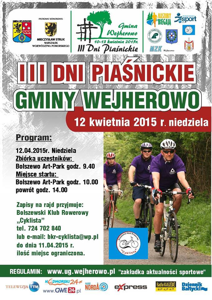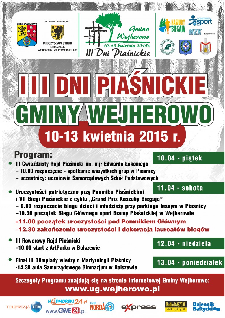 Od 10 do 13 kwietnia 2015 r. odbędą się III Dni Piaśnickie Gminy Wejherowo. Jest to jedno z najważniejszych cyklicznych wydarzeń organizowanych przez nasz samorząd. Od trzech lat mają one charakter wielopłaszczyznowy, angażujący dzieci, młodzież i osoby dorosłe w przedsięwzięcia o charakterze sportowo – rekreacyjnym i edukacyjnym.