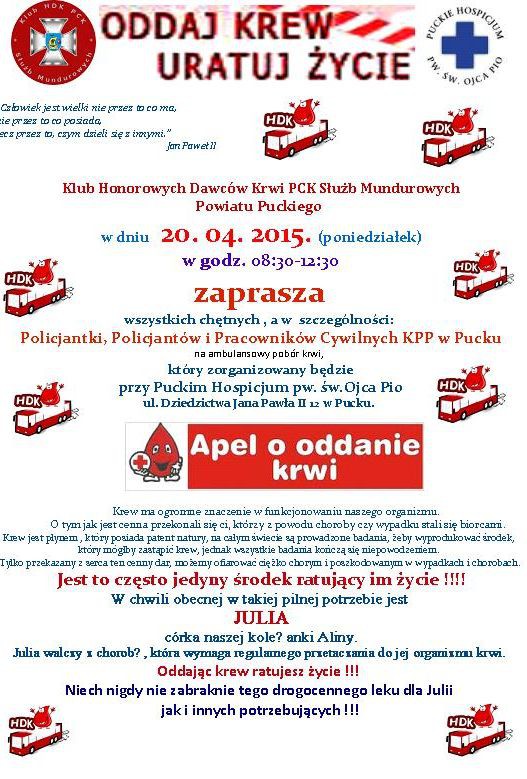 16-letnia Julia córka pracowniczki Komendy Powiatowej Policji w Pucku walczy z chorobą i wymaga regularnego przetaczania krwi. Dlatego członkowie Klubu Honorowych Dawców Krwi PCK Służb Mundurowych Powiatu Puckiego zorganizowali Akcję pod hasłem „ODDAJ KREW URATUJ ŻYCIE” , której celem jest zbiórka krwi dla wszystkich potrzebujących, a w szczególności dla chorej Julii.